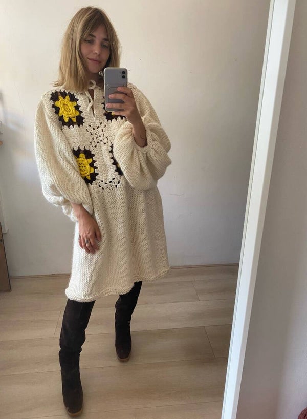 Flexible size. Model wears it with size S and 1,63cm height. The body is made of vintage granny squares from acrylic yarn and the sleeves and skirt are knitted with 100% soft organic wool.
