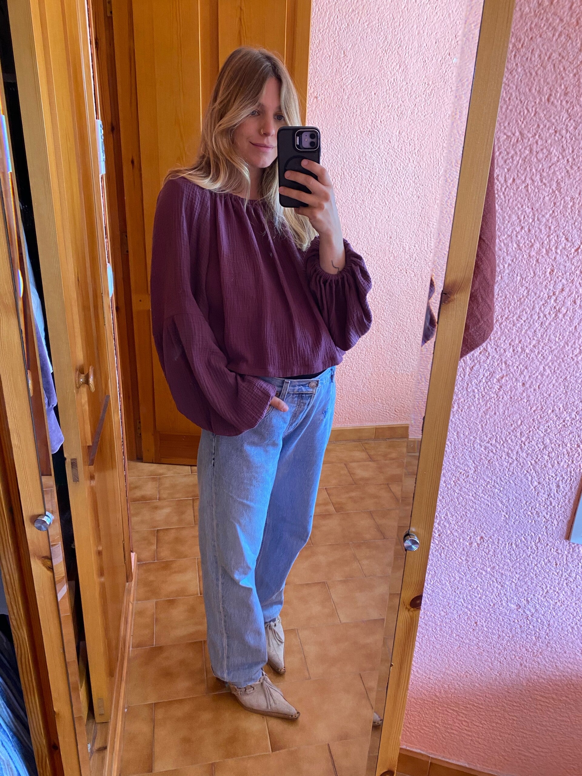 The sleeves have a slight different color than the body, barely noticable when wearing, reflected in the price.